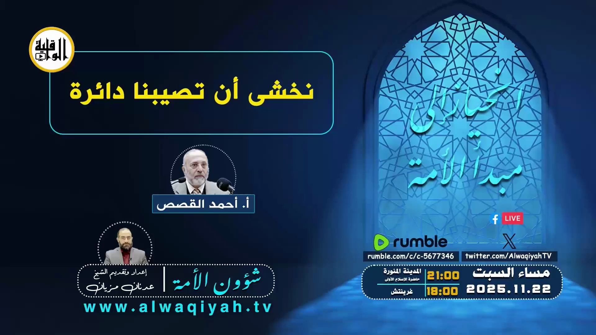 شؤون الأمة: نخشى أن تصيبنا دائرةحوار مع أ. أحمد القصصالسبت 01 جمادى الآخرة 1447 هـ الموافق 22 تشرين ثاني 2025م