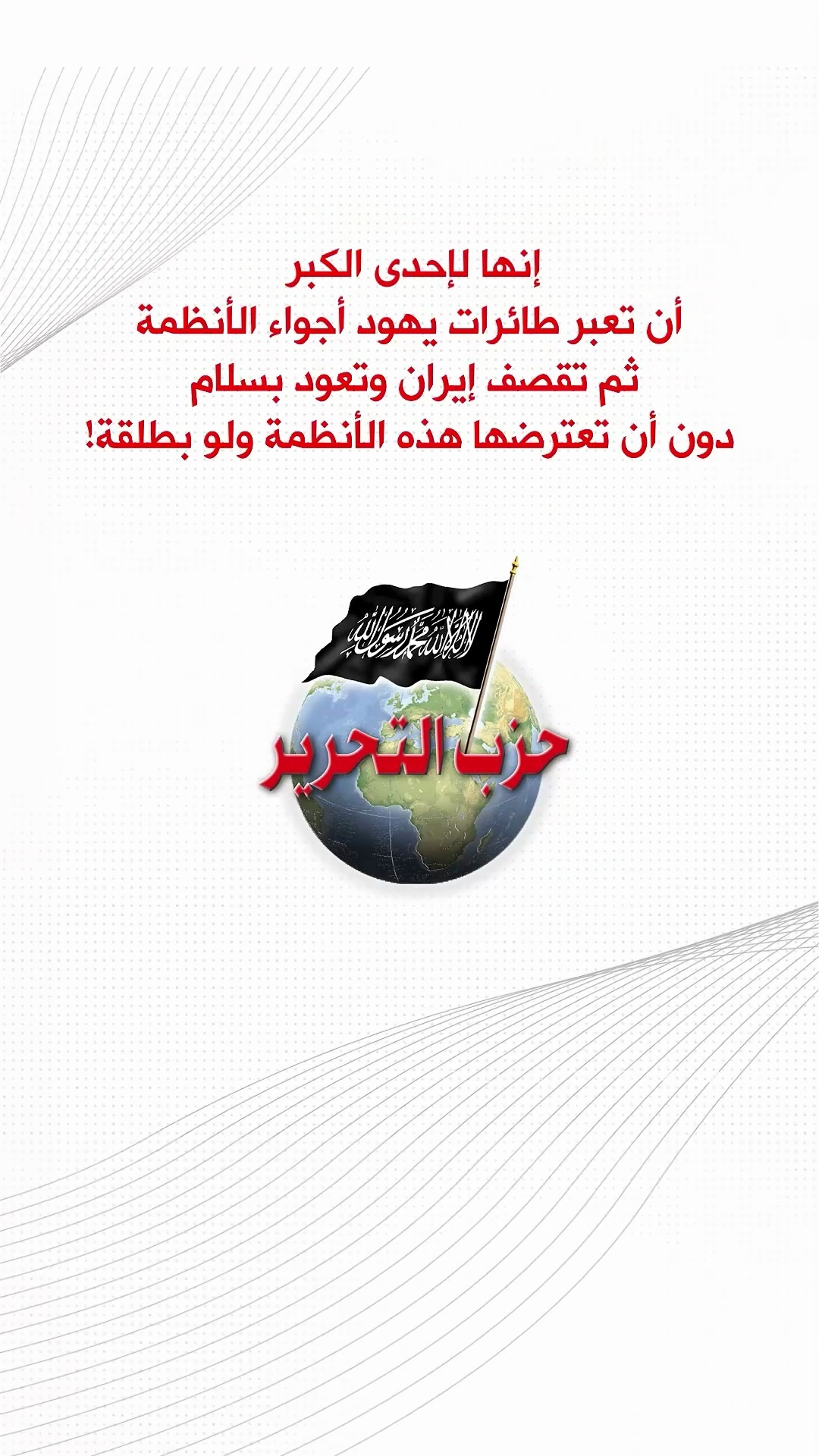 تقرير حول إصدار لحزب التحرير بعنوان إنها لإحدى الكبر أن تعبر طائرات يهود أجواء الأنظمة ثم تقصف إيران وتعود بسلام‎ للإطلاع على الإصدار كاملاً https://hizb-uttahrir.info/ar/index.php/leaflets/hizb/103217.html