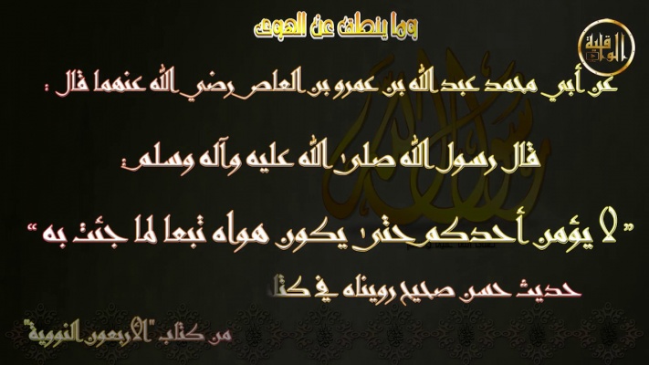 ( عن أبي محمدٍ عبدالله بن عمرو بن العاص ‑رضي الله عنهما‑ قال: قال رسول الله ‑صلى الله عليه وسلم‑ : "لا يؤمن أحدكم حتى يكون هواه تبعًا لما جئت به" ). حديثٌ صحيح، رويناه في (كتاب الـحجة) بإسنادٍ صحيحٍ