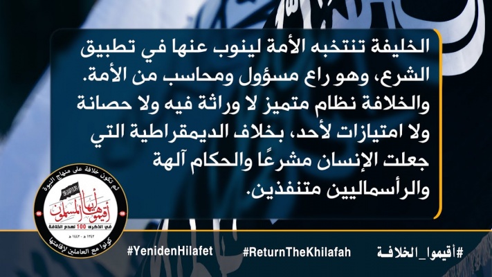الخليفة تنتخبه الأمة لينوب عنها في تطبيق الشرع، وهو راع مسؤول ومحاسب من الأمة. والخلافة نظام متميز لا وراثة فيه ولا حصانة ولا امتيازات لأحد، بخلاف الديمقراطية التي جعلت الإنسان مشرعًا والحكام آلهة والرأسماليين متنفذين.